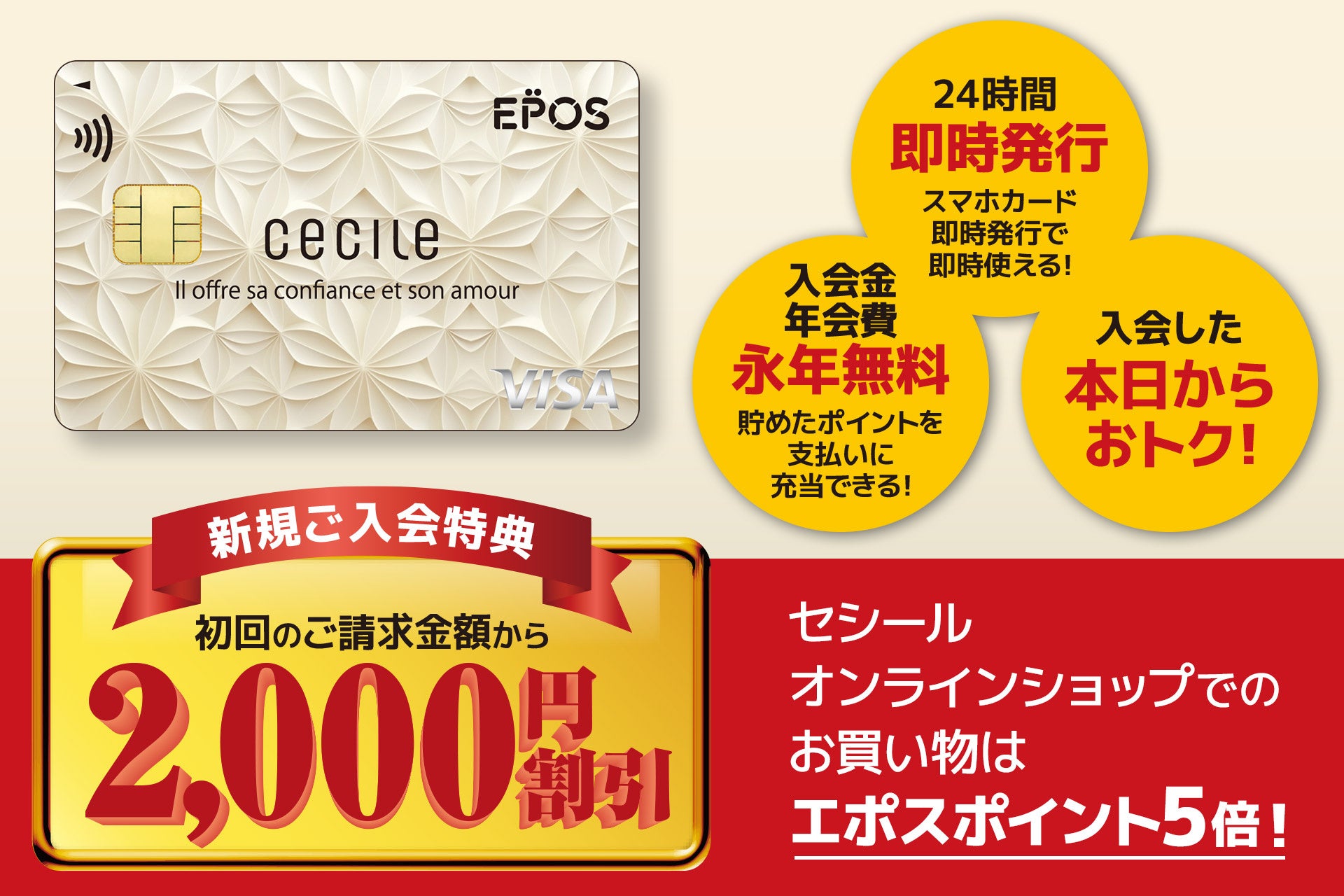 ご入会後4カ月以内に「セシールオンラインショップ」でご利用いただくと、入会特典としてご利用代金から2,000円割引となります。(※セシールエポスカードをご利用で請求時に割引となります。)さらに、「セシールオンラインショップ」でのご利用ではいつもエポスポイントが5倍になります。