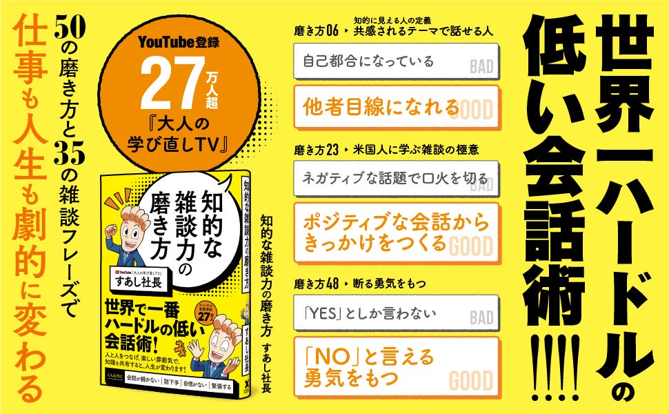チャンネル登録者27万人超『大人の学び直しTV』の超人気YouTuberが教える世界一ハードルの低い会話術!『知的な雑談力の磨き方』8月26日発売!