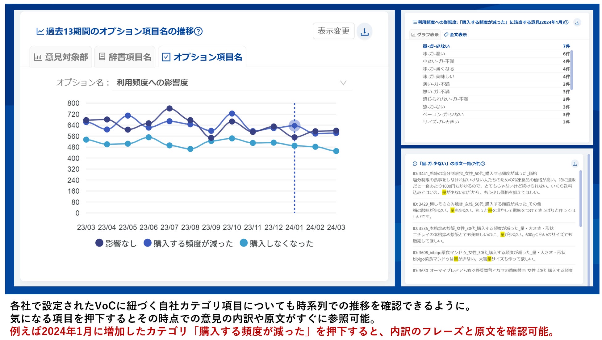 VoC(顧客の声)のフレーズごとの属性分析・影響分析が可能に。辞書で設定した項目や読み込んだカテゴリー項目の時系列変化も観測可能に。テキストに限らずVoCを統合活用する業務支援ツールへ。