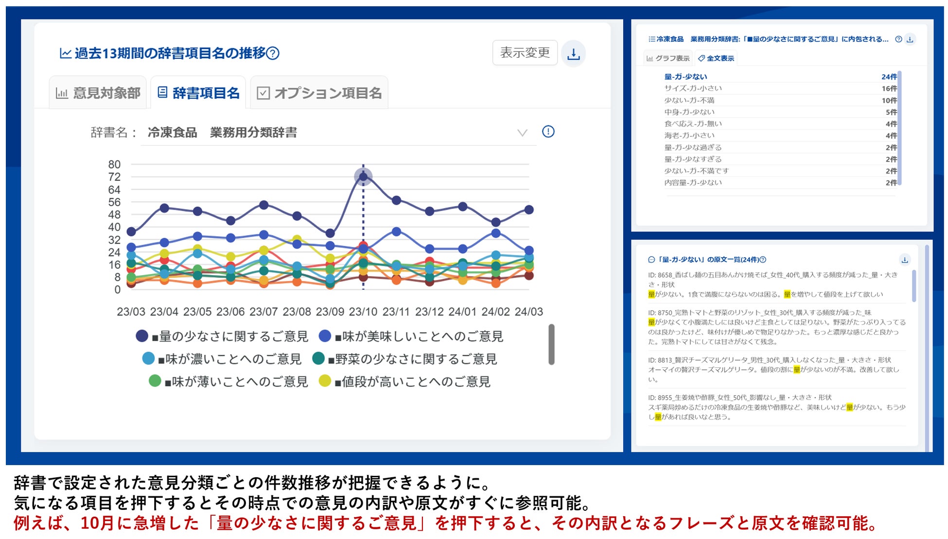 <画面イメージ>辞書で設定した項目ごとの時系列分析(辞書に基づき自動集約)