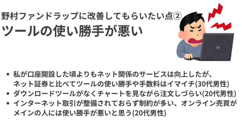 さらに「ツールの使い勝手の悪さ」も複数のユーザーから指摘されており、「ネット証券と比較するとツールの機能性が低い」といった快適な取引環境を求める意見が目立った。