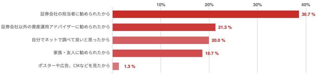 また、その他には、「証券会社以外の資産運用アドバイザーに勧められたから(21.3%)」「自分でネットで調べて良いと思ったから(20.0%)」「家族・友人に勧められたから(18.7%)」などがあがった。