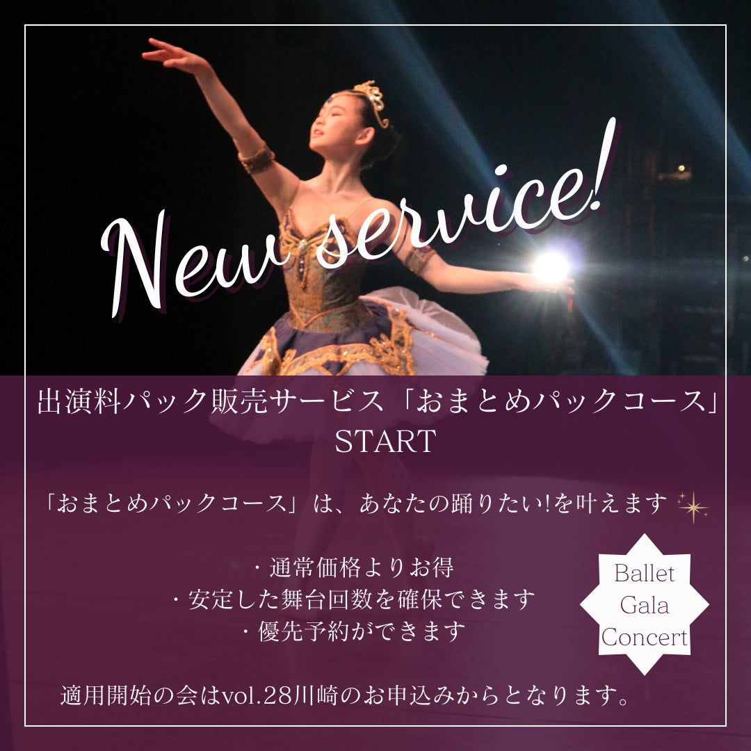 バレエガラコンサートに定期的にご出演いただいている皆様に少しでもご負担を軽くご出演いただけるよう、この度、出演料『おまとめパックコース』が新登場しました。バレエガラコンサートでは既存の割引制度を複数ご用意していますが、その割引制度より更にお得な割引率で、また一般の受付開始より前に優先申込可能であったりと、他にも様々なお得なポイントがあります。本コースの適用開始は、vol.28 in川崎会場のお申込みからとなっています。