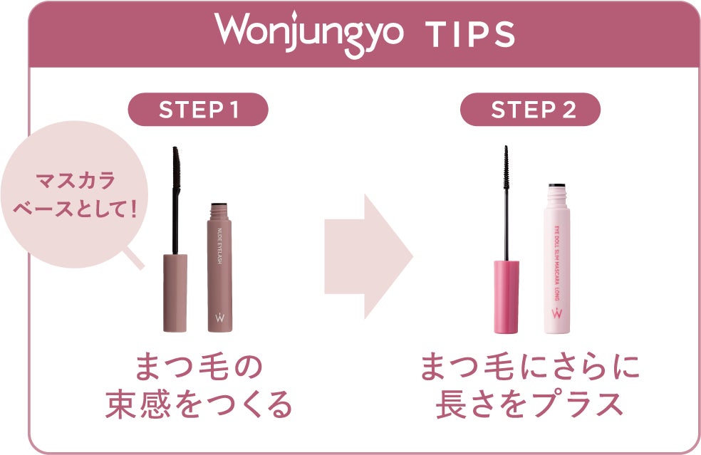 新商品が登場するたびにSNSで話題を集める「ウォンジョンヨ」のメイクアイテムの中でも、ブランドを代表する人気アイテムのマスカラ。既存の「ウォンジョンヨ ヌードアイラッシュ」は、入荷するたびに即売り切れとなる店舗が続出し、様々な媒体でもベストコスメを受賞している実力派のアイテムです。そんなウォンジョンヨから新たにロングタイプのマスカラ「ウォンジョンヨ アイドールスリムマスカラ ロング」が登場。ダマになりにくいセパレート処方で、まるでお人形のようなぱっちりまつ毛を叶えます。ストレート型の極細ブラシが短いまつ毛も1本1本しっかりキャッチし、複数回重ね塗りすることで繊細な束感まつ毛を誰でも簡単に演出。さらに、キープワックス配合によりくるっと上向きのカールを長時間キープできるのもポイントです。