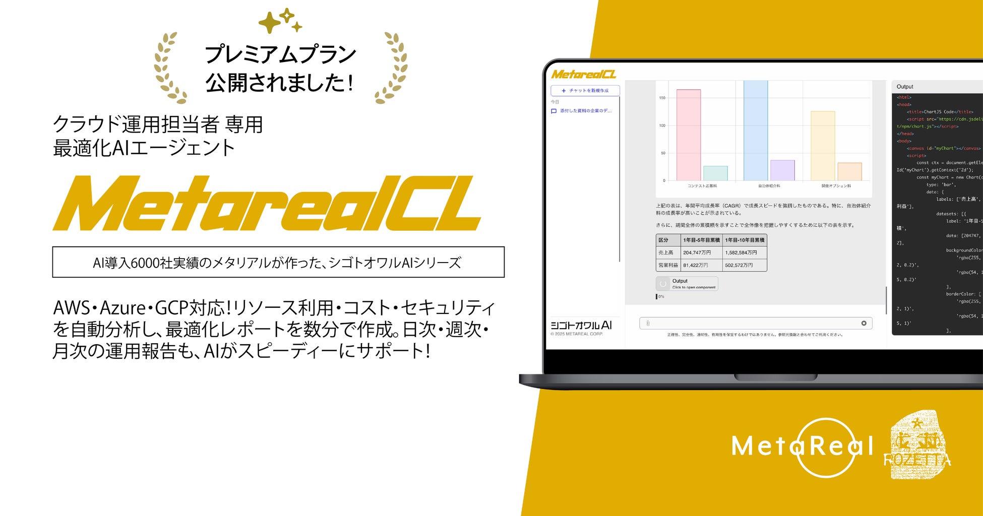 業種特化の専門AI開発・運営を行うメタリアル・グループの株式会社ロゼッタ(代表取締役:五石 順一)は、クラウド運用最適化レポート作成AIエージェント「Metareal クラウド」(以下、Metareal CL)を1日20回・月200回使える月額5万円(税込)のプレミアムプランを7月9日(水)より提供開始しました。