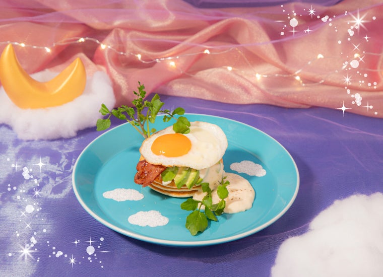 鈴陽向さんのアイデアであるパンケーキの上に、ベーコンや目玉焼き、アボカドをのせたお食事系パンケーキです。