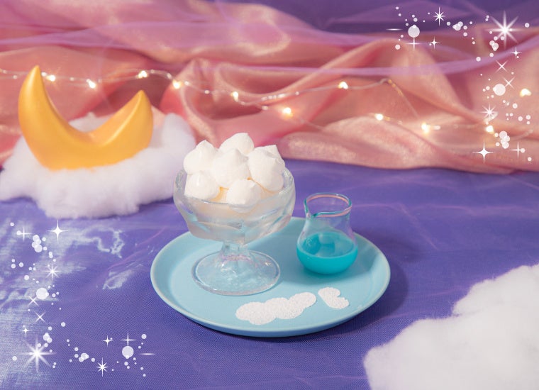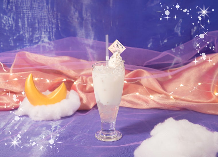 アイスを求肥で包んだだいふく風アイスに、丸く絞ったホイップをのせて入道雲を表現しました。真っ白なパフェに別添えのブルーソースをかけて、「あと一歩」なパフェを完成させてお召し上がりください♪