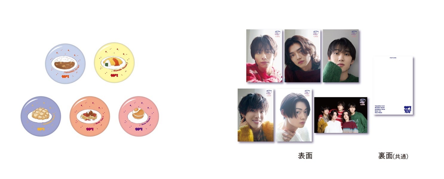 メニューは、山下幸輝さんの好物カレーと焼肉がセットになったボリューム満点のメニュー、宮武颯さんの好物である塩おむすびを真ん中に盛り付けた味変できるオムライス、鈴川直弥さん考案のメロンパンを使用した甘党にぴったりのデザートバーガー、池田優斗さん考案のチーズボールにトマトクリームパスタがセットのオシャレなメニュー、鈴陽向さん考案の雲をあしらったお食事系パンケーキなど、“メンバー考案の見て楽しい、食べて美味しいカフェメニュー”をみなさまにご提供いたします。その他、WILD BLUEをイメージしたデザートやドリンク、メッセージを書いてお祝いできるプレートメニューなどをご用意いたしました。