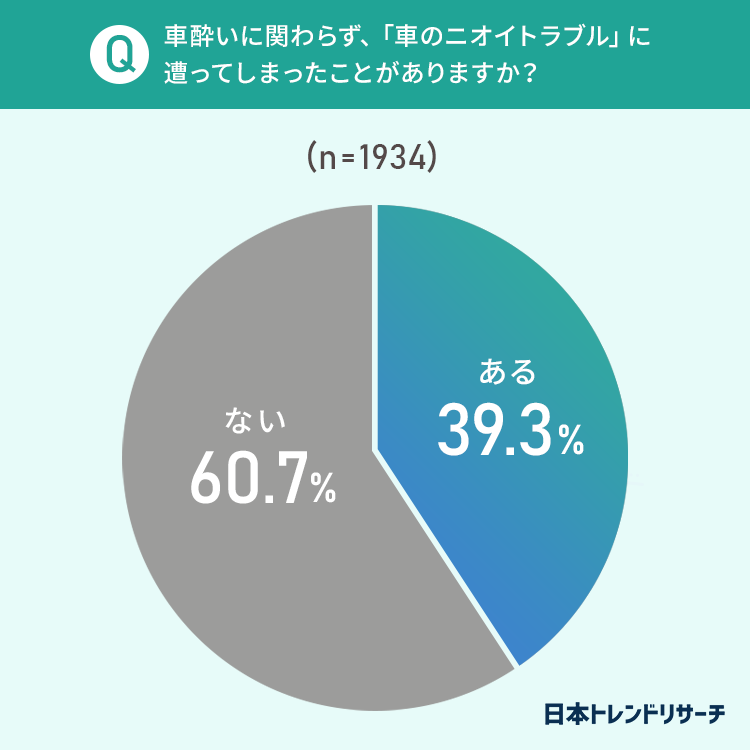 まずは、車酔いをしたことがある男女1934人の方に、ニオイが原因で車酔いしたことがあるか聞きました。