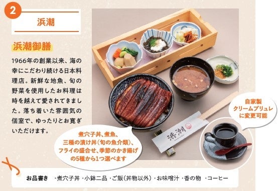 対象となるお土産はカブトビールや日本酒といった醸造品、名店の和菓子等10商品から選ぶことができます。またランチメニューは新規3店舗を加えた計6店舗で知多牛や知多半島の地魚の寿司等、半田ならではのグルメをお楽しみいただけます。