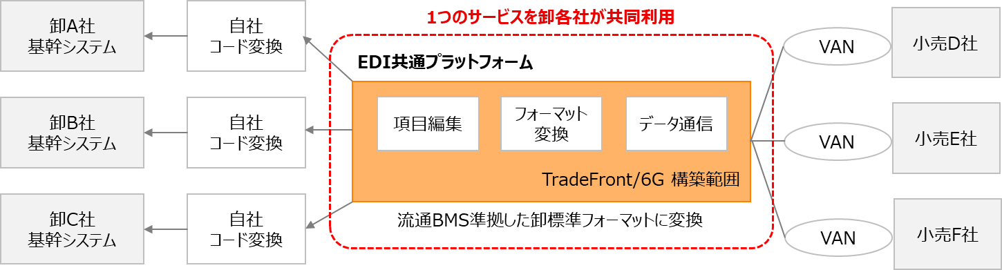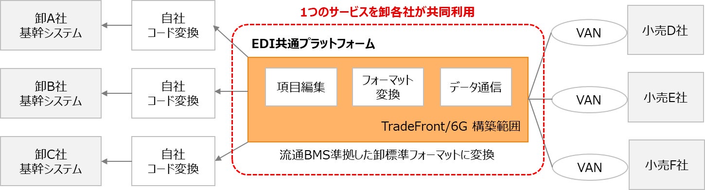 当社は、本構想におけるEDI共通基盤のサービスベンダーの1社として、国内最大規模のEDIサービス基盤「Fujitsu 流通EDIサービス TradeFront/6G(トレードフロントシックスジー)」(以下、「TradeFront/6G」)を活用し、「EDI共通プラットフォーム」を構築しました。