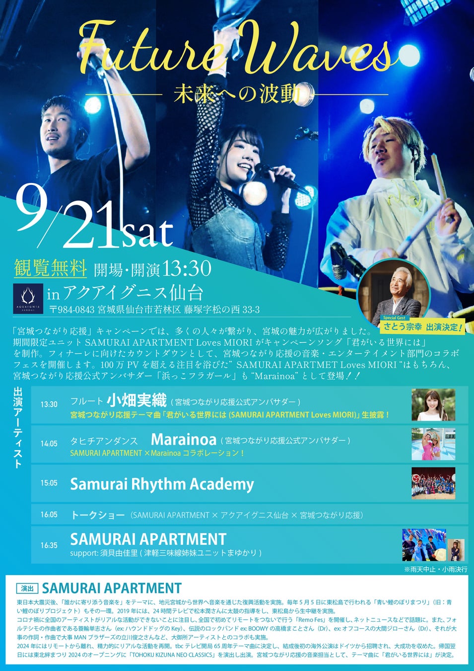 本フェスは、SAMURAI APARTMENT主催で実現し、スペシャルゲストとしてさとう宗幸さんが登場します。当日は、彼の代表曲「青葉城恋唄」がSAMURAI APARTMENTのアレンジにより「青葉城恋唄~未来へ繋ぐうた~」として本人とのコラボで披露され、宮城の観客に感動を届けます。
