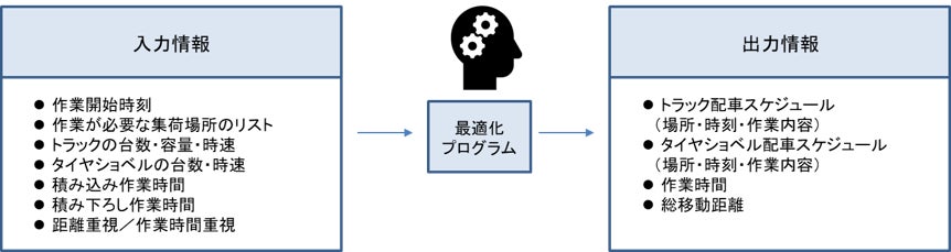 AIプログラムは、集荷希望日・集荷場所、タイヤショベルやトラックの台数、優先したい条件(時間や距離等)を入力すると、タイヤショベルとトラックの最適なルートを地図上に表示します。