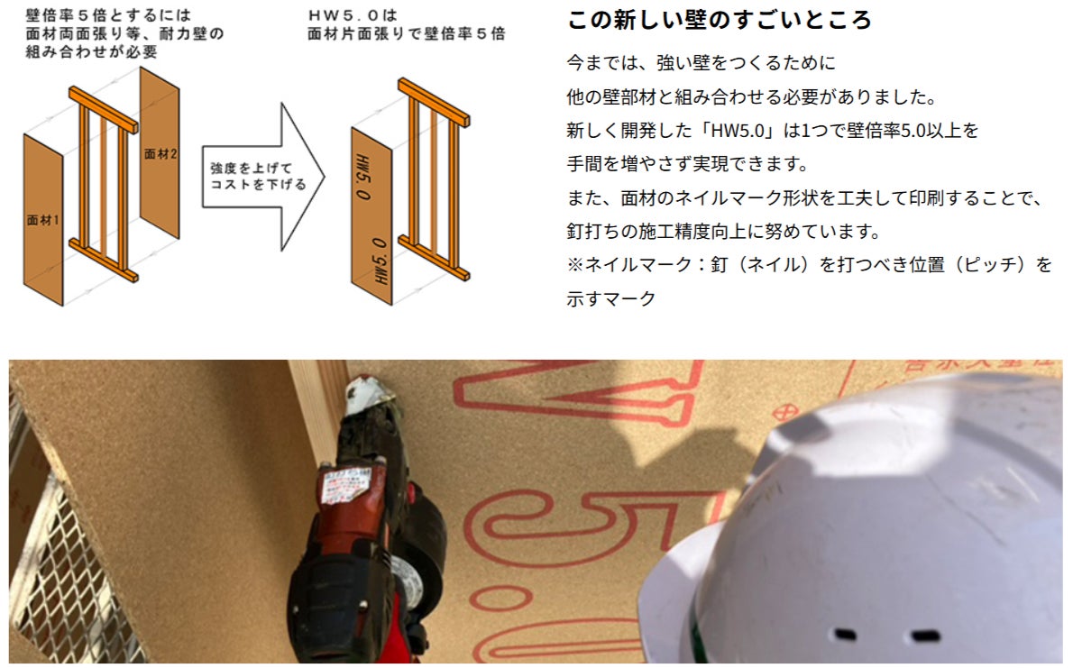 木製筋交いを用いた壁倍率5.0の大臣認定耐力壁としては第1号である「HW5.0Σ」や、施工効率と品質向上を両立する「HT Base基礎一体打ち工法」など、現場の課題から生まれた技術の開発背景や工夫についても分かりやすく紹介しています。