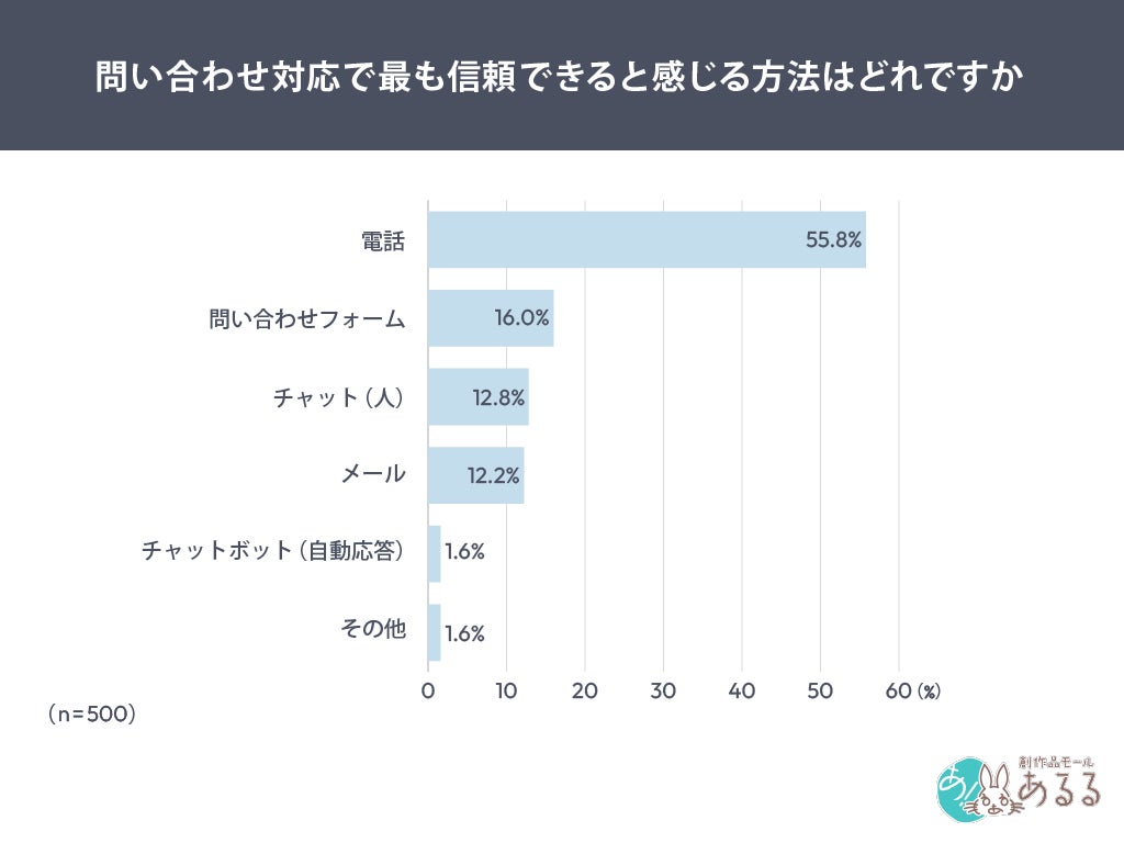 問い合わせ対応で最も信頼できると感じる方法としては、「電話」が55.8%で最多となりました。