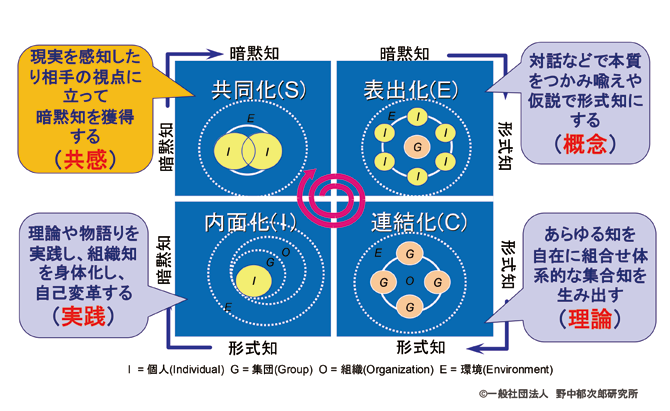 相手の視点に立って共感し、暗黙知を共有・創発し(共同化)、対話を通じて本質をつかみ、レトリックなどを駆使して言葉、コンセ プトにしていく(表出化)。そのコンセプトをあらゆる知を総動員して、理論や戦略、「物語り」などの集合知にし(連結化)、その集合知を実践し、身体化する(内面化)。このプロセスをダイナミックにスパイラルアップさせていくことで組織的イノベーションは可能になります。
