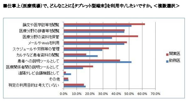 なおタブレット型端末の利用方法は、「論文や医学誌等を閲覧」などコンテンツ閲覧・保管目的が多く、次いで「メールやWEB」「患者説明」で挙がった。