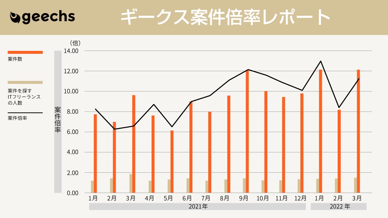 ギークス株式会社(本社:東京都渋谷区、代表取締役CEO:曽根原 稔人、以下ギークス)は、案件数と案件を探すITフリーランスの人数から算出した「案件倍率」をまとめた、「ITフリーランス案件倍率レポート」を発表いたします。このデータは、ITフリーランス市場における需給トレンドを表すものです。ギークスでは、本レポートを四半期に一度発表しており、今回は2022年1〜3月の案件倍率をまとめています。