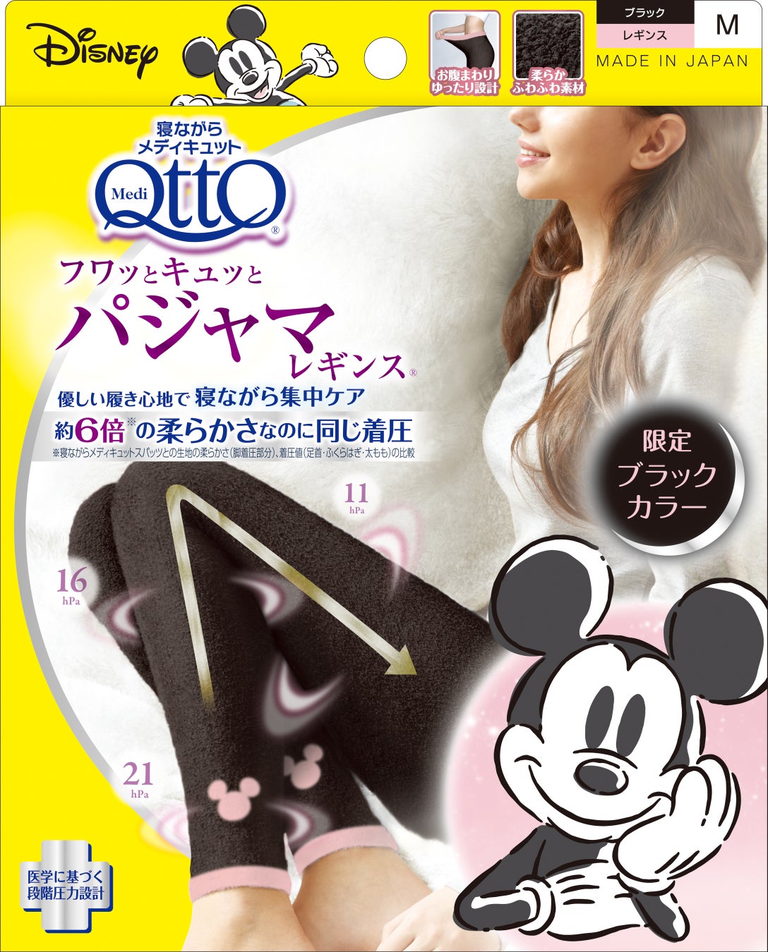 優しいはき心地で寝ながら集中ケア「寝ながらメディキュット フワッとキュッと パジャマレギンス」に“限定ブラックカラー×ピンクのミッキーデザイン”登場