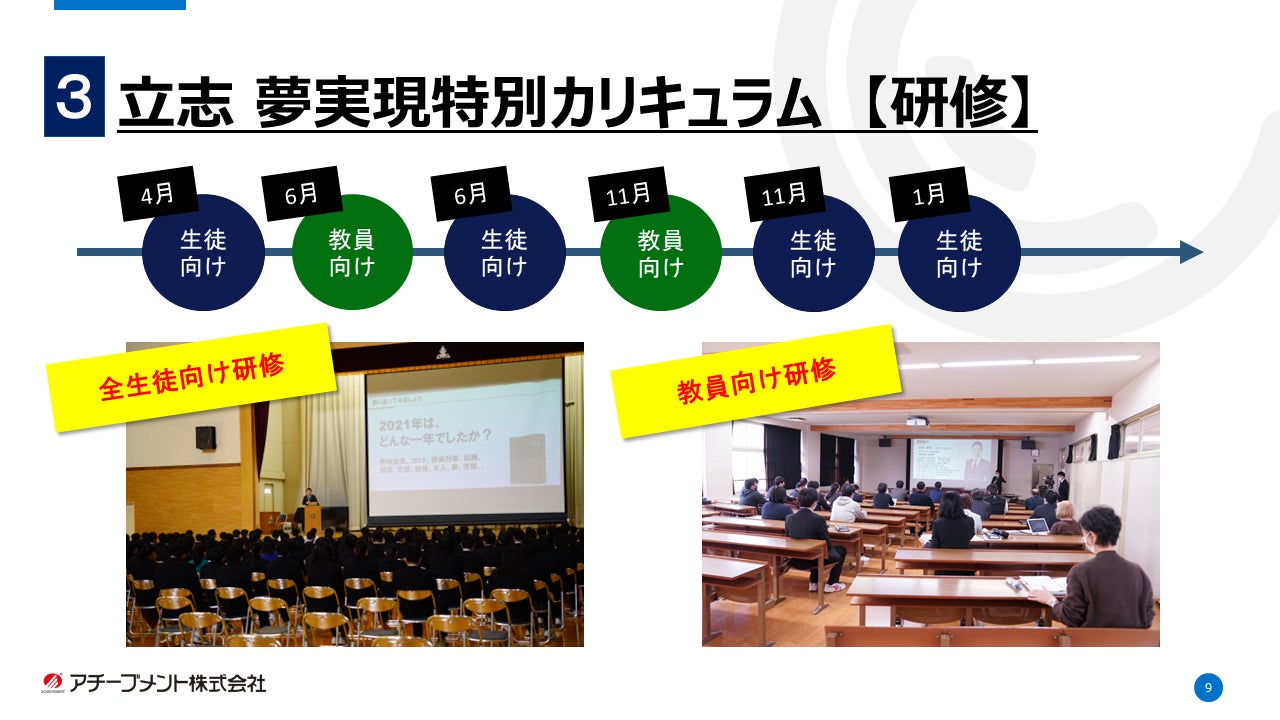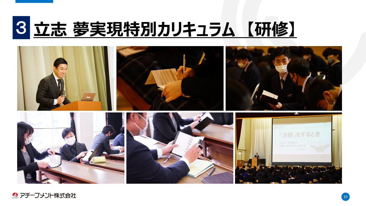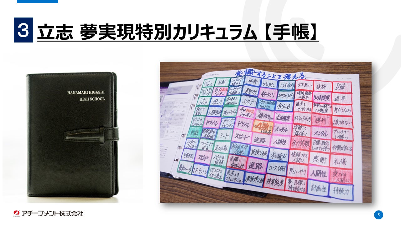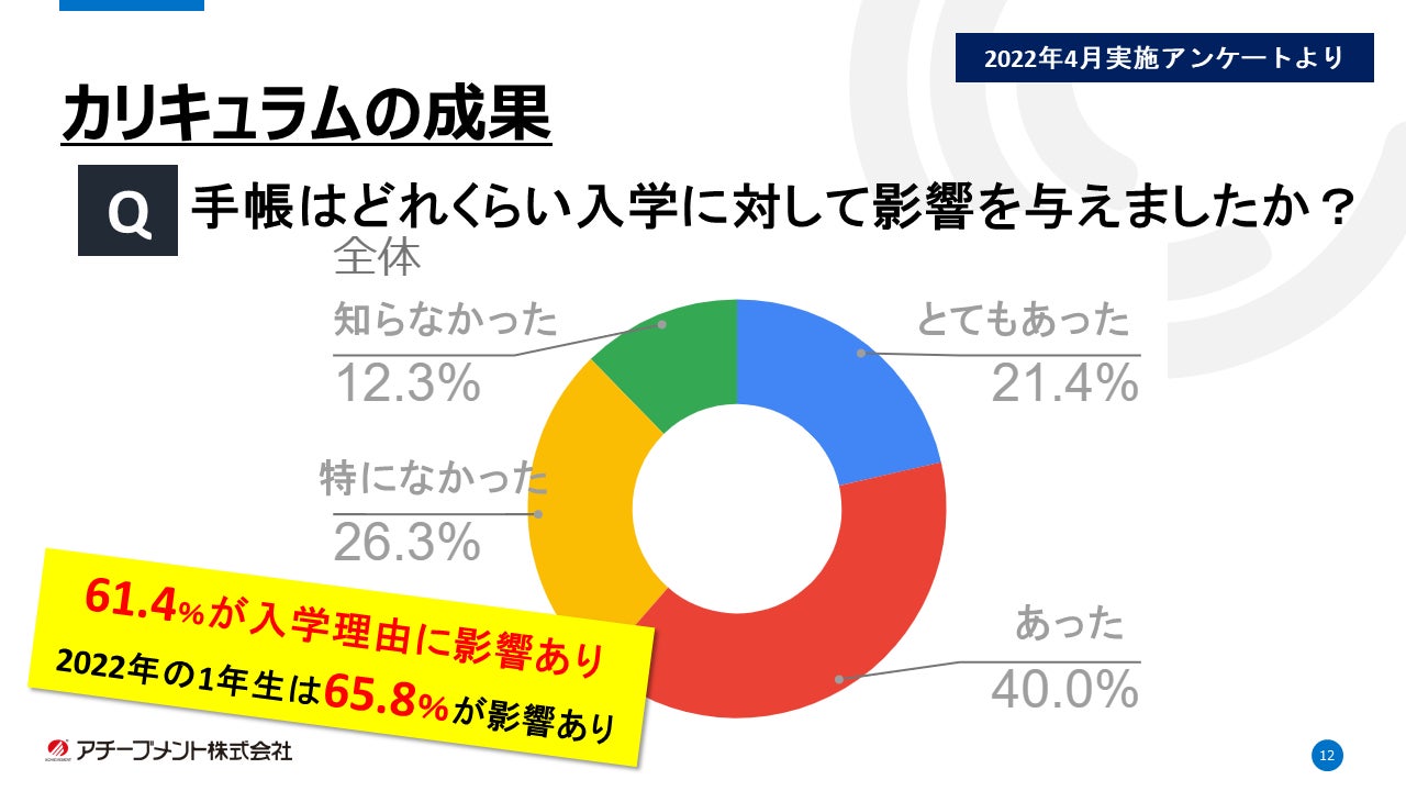 アチーブメント株式会社(所在地:東京都江東区、代表取締役会長 兼 社長:青木仁志)は、2019年より花巻東高等学校での全校生徒を対象にした「オリジナル生徒手帳を活用した夢実現教育」をサポートしてきました。その取り組みがこの春から4年目をスタートしておりますが、新入生の実に65.8%が「このカリキュラムの存在が学校選びに影響した」とお答えいただいております。6月24日(金)には、2回目の生徒向け特別授業が花巻東高等学校にて開催される予定です。