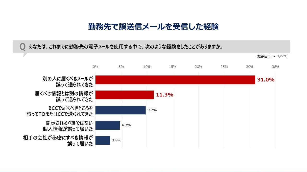 誤送信メールを受け取った経験、「別の人宛てのメールが届いた」31.0%、「別の情報が届いた」11.3%