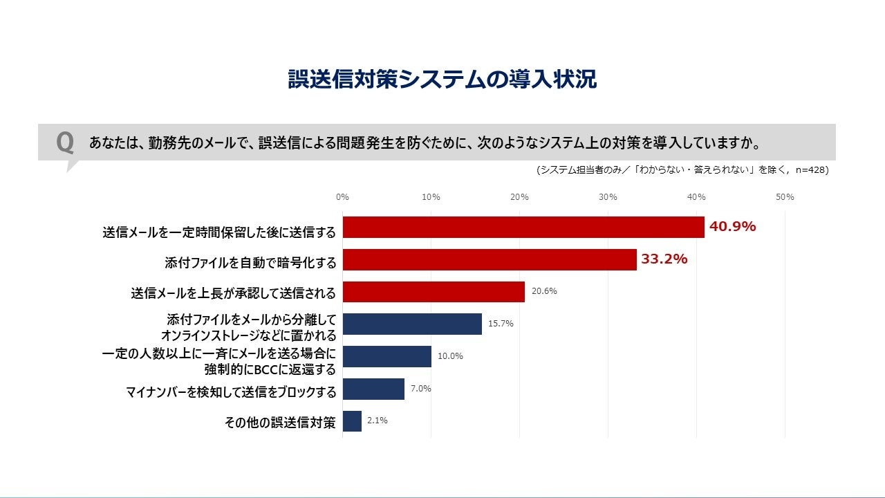 導入割合が高い誤送信対策は、「送信メールを一定時間保留した後に送信する」40.9%、「添付ファイルを自動で暗号化する」33.2%、「送信メールを上長が承認して送信される」20.6%です。