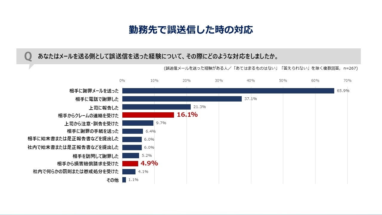 多く挙げられた回答は、「相手に謝罪メールを送った」65.9%、「相手に電話で謝罪した」37.1%、「上司に報告した」21.3%。相手との重大な対応としては、「相手からクレームの連絡を受けた」16.1%、「相手に始末書または是正報告書などを提出した」は5.9%、「相手から損害賠償請求を受けた」は4.9%。
