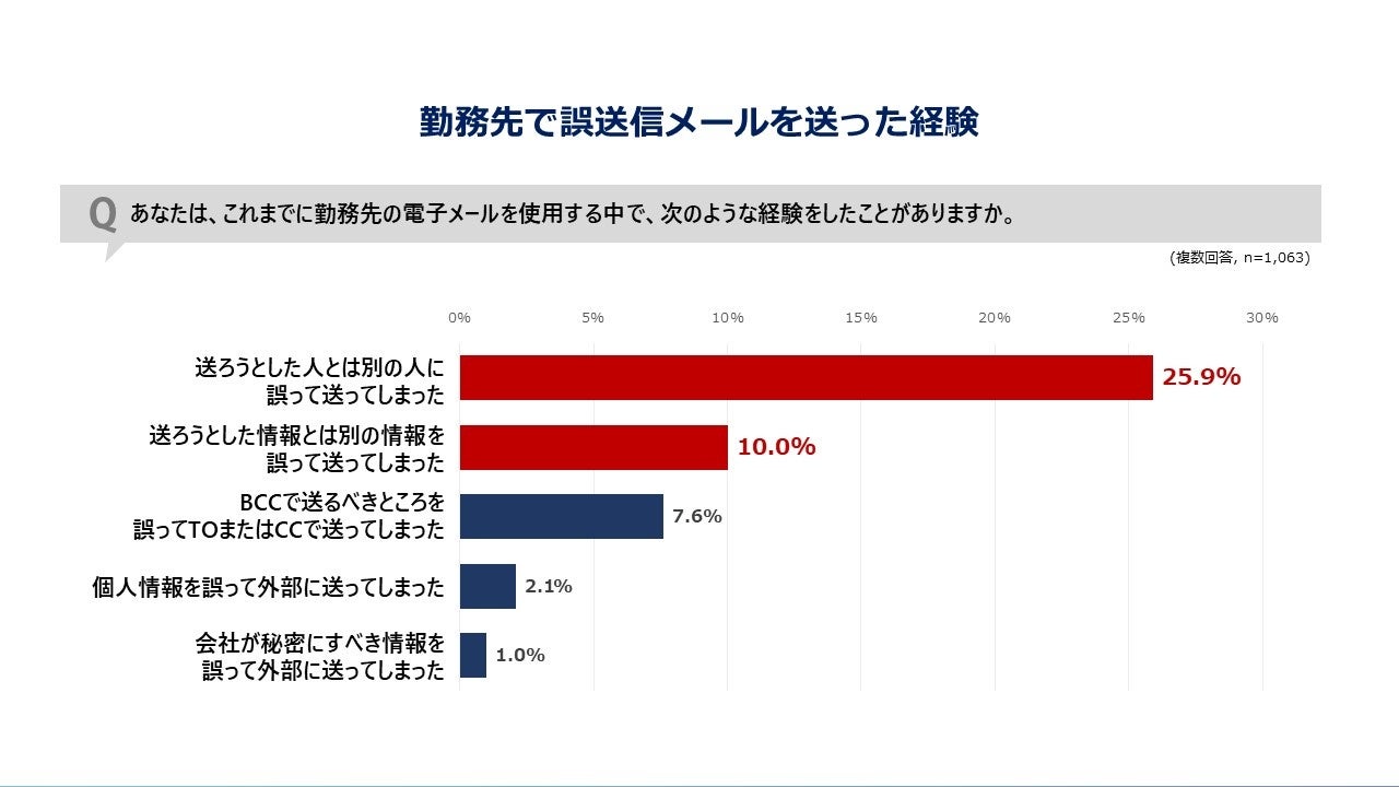 多く挙げられた回答は、「送ろうとした人とは別の人に誤って送ってしまった」25.9%、「送ろうとした情報とは別の情報を誤って送ってしまった」10.0%。重大な誤送信メールを送った割合は、「BCCで送るべきところを、誤ってTOまたはCCで送ってしまった」7.6%、「個人情報を誤って外部に送ってしまった」2.1%、「会社が秘密にすべき情報を外部に送ってしまった」1.0%。