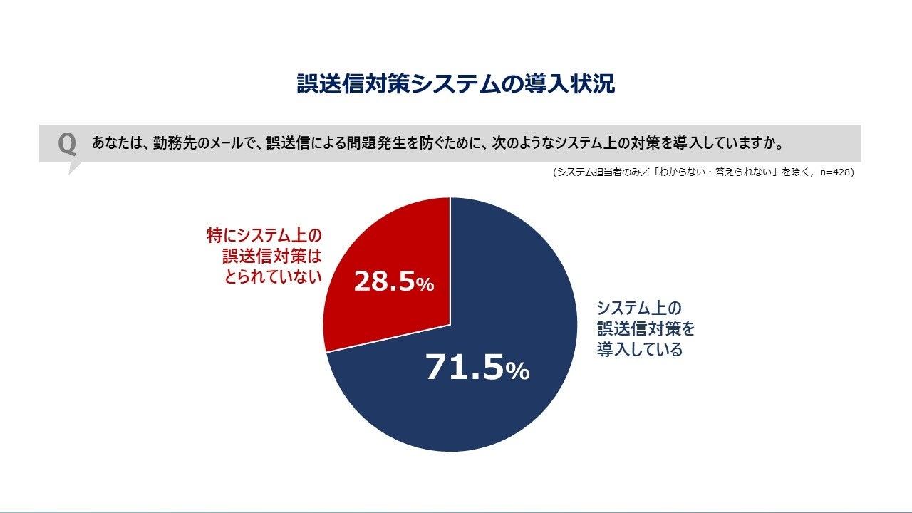 メールで誤送信をしないように注意を促したとしても、人はミスをする可能性があるため、誤送信を自動で防ぐシステム導入の対策が求められます。「システム上の電子メールの誤送信対策を導入している」企業は71.5%と7割以上です。一方、導入していない企業は28.5%とおよそ3割で、これらの企業はメールの誤送信対策のリスクに十分備えられているとは言えず、これらの企業の対策導入が期待されます。