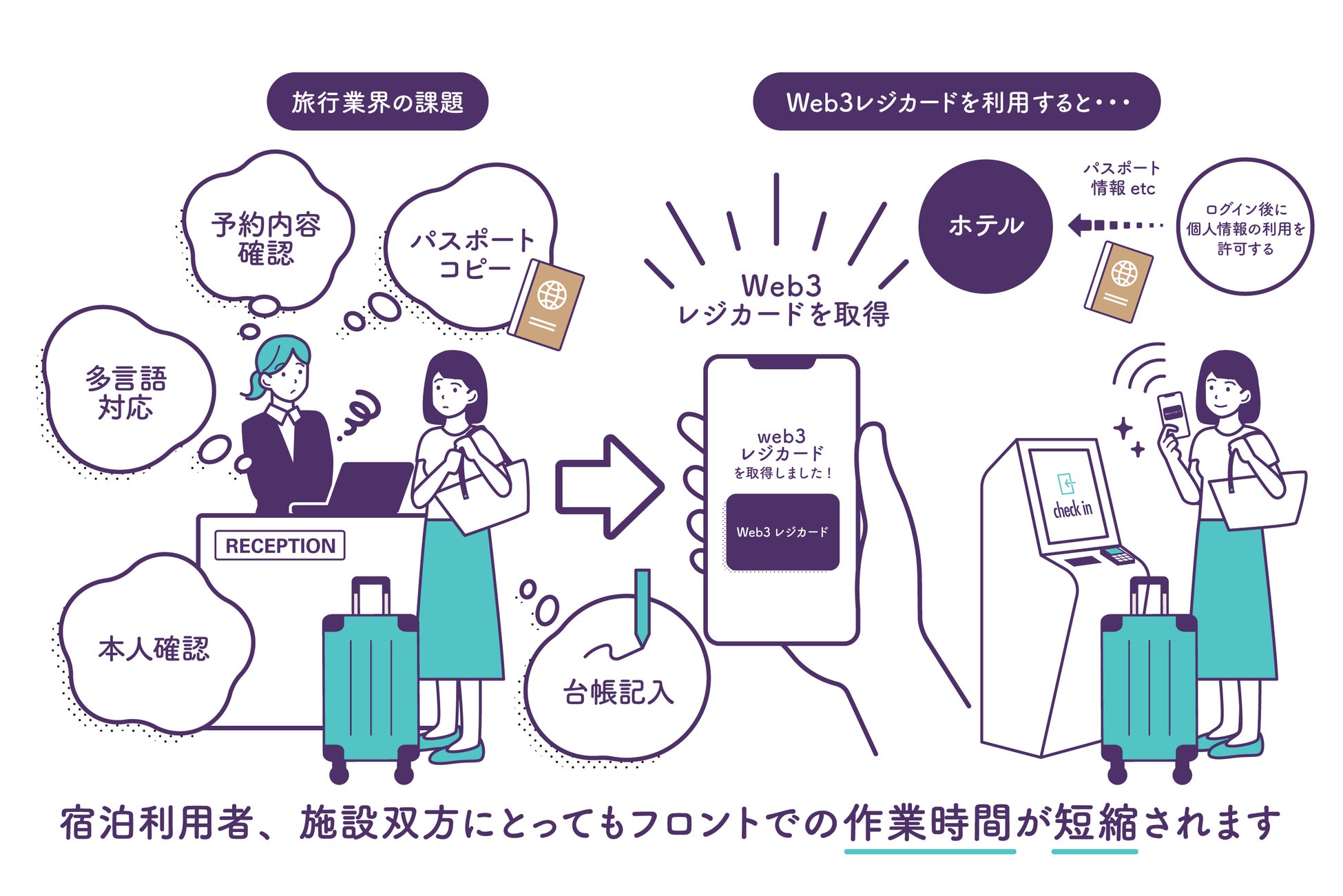 「Web3レジカード」は一度ユーザー登録をすると、宿泊先が変わっても同サービスが導入されている施設であればユーザーは何度もレジストレーションカード記入が不要となり*²、セルフチェックインが可能となるサービスを目指しています。