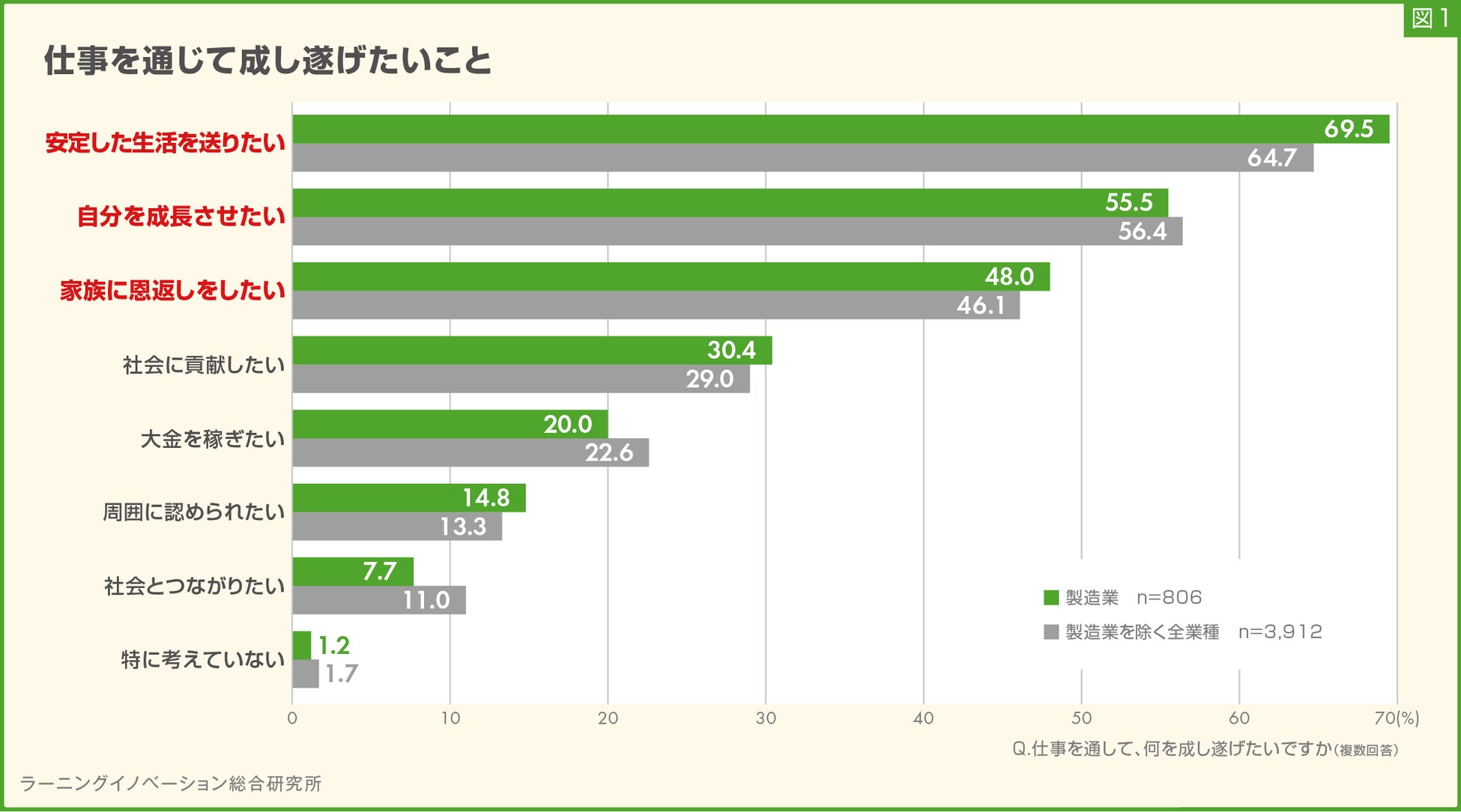 1. 仕事で成し遂げたいこと「安定した生活を送りたい」が69.5%で過去最高に