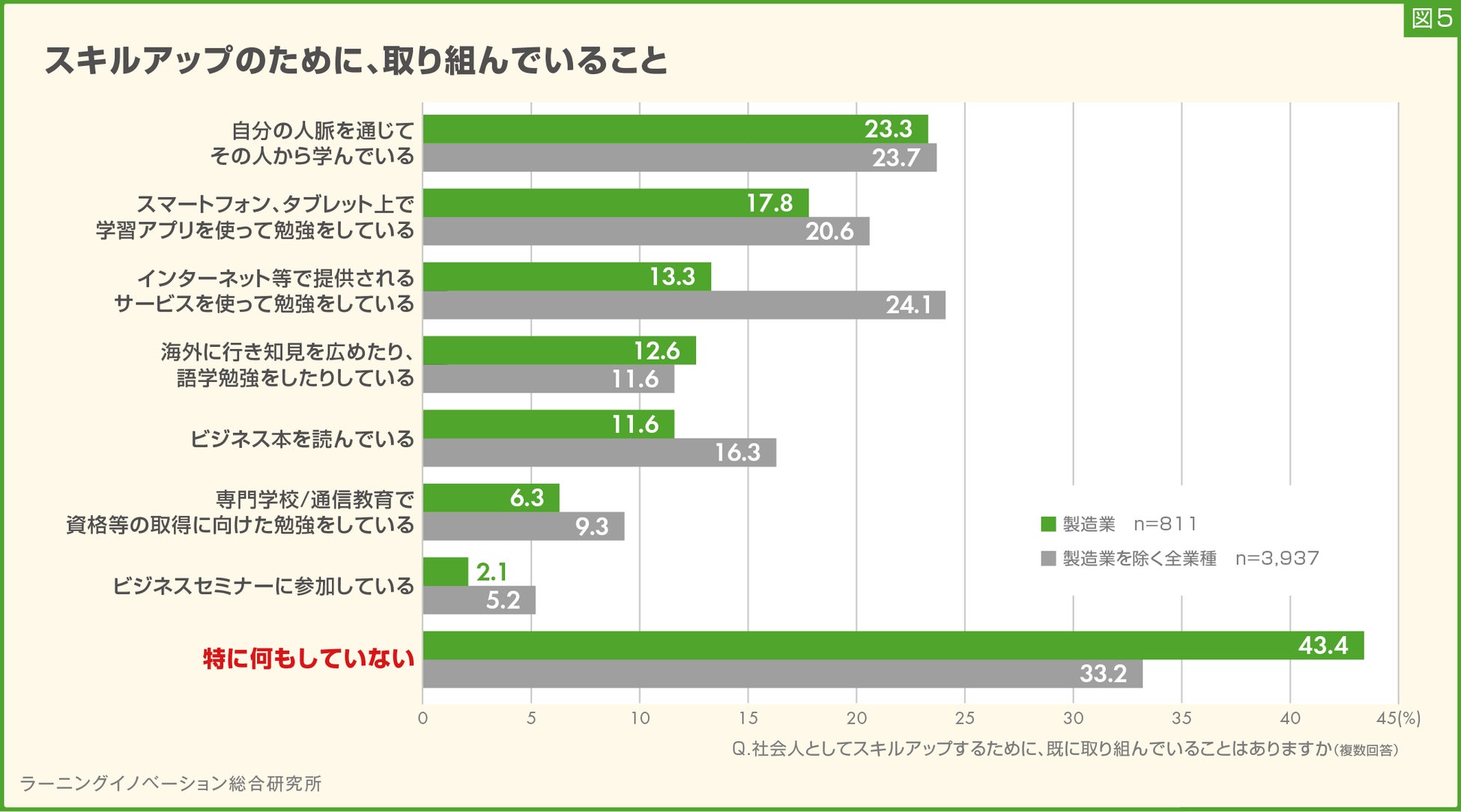 将来、「専門家」としてのキャリアを歩みたいと考えている新入社員が最も多いことがわかりましたが、スキルアップのために取り組んでいることはあるのでしょうか。結果、回答時点では「特に何もしていない」が43.4%で、他業種よりも10ポイント以上高い回答割合となりました(図5)。
