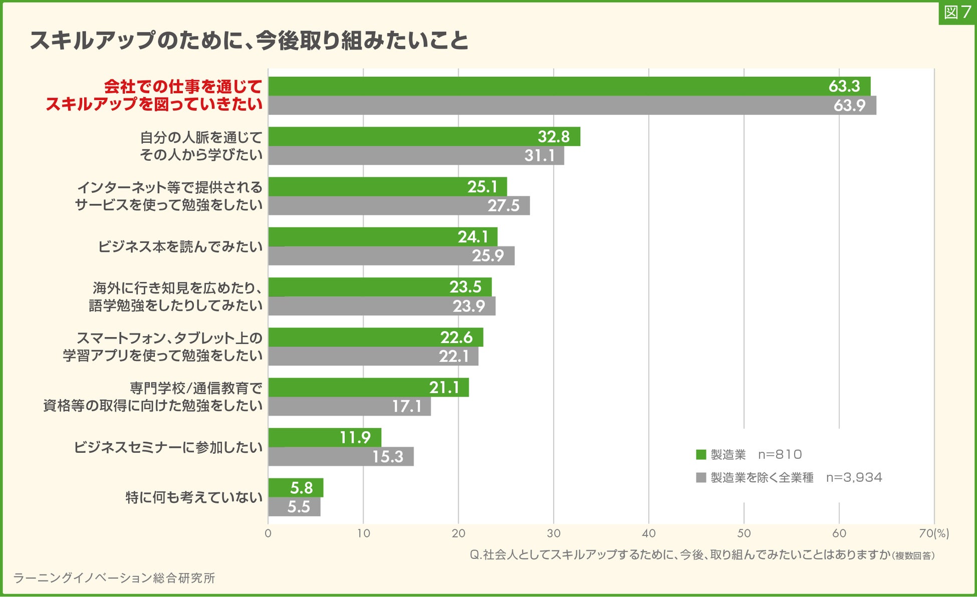 現時点でスキルアップの取り組みをしていない割合が、他業種より高い実情が明らかとなりましたが、これからスキルアップのために取り組みたいことは何か聞いたところ、「会社での仕事を通じてスキルアップを図っていきたい」が63.3%で最も多く、仕事の経験から自己成長をしていきたいという考えを持っていることがわかりました。(図7)