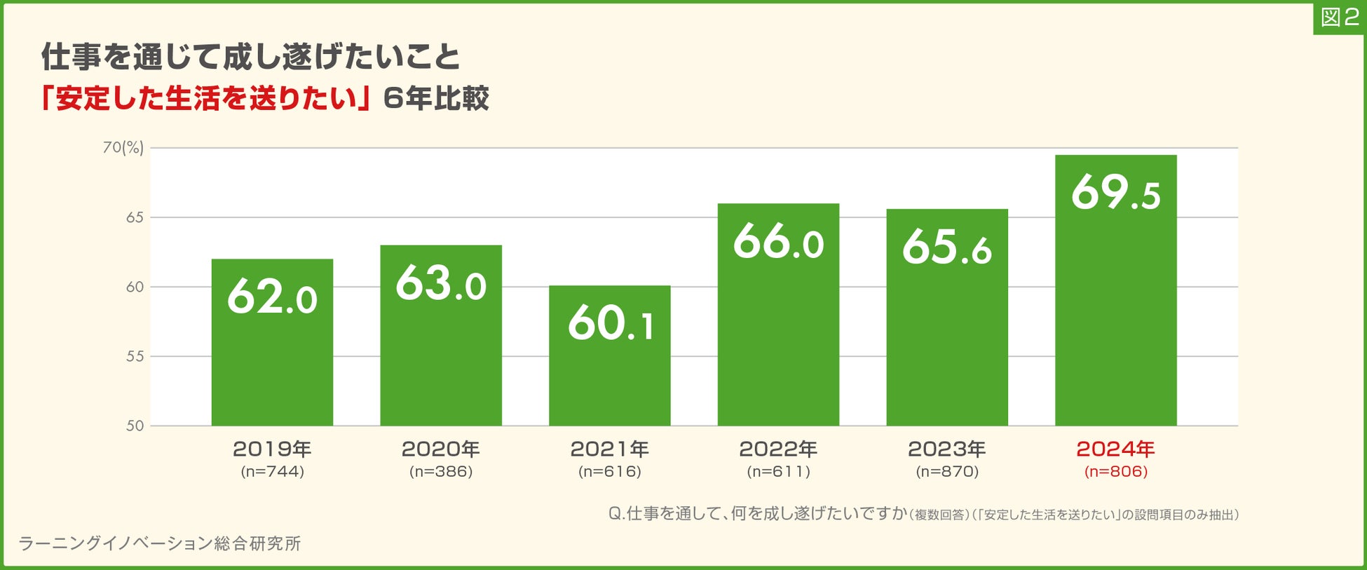 仕事で成し遂げたいこと「安定した生活を送りたい」が69.5%で過去最高に