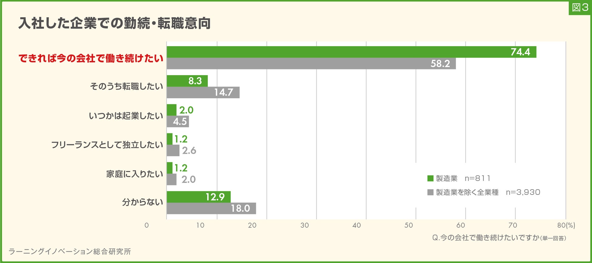 安定志向の高い製造業の新入社員に、入社した企業で働き続けたいか質問したところ、「できれば今の会社で働き続けたい」が74.4%となり、他業種より16.2ポイント高い割合となりました。一方、「そのうち転職したい」は8.3%で、他業種より6.4ポイント低い結果となり、今の会社での勤続意向が高いことがわかりました。(図3)