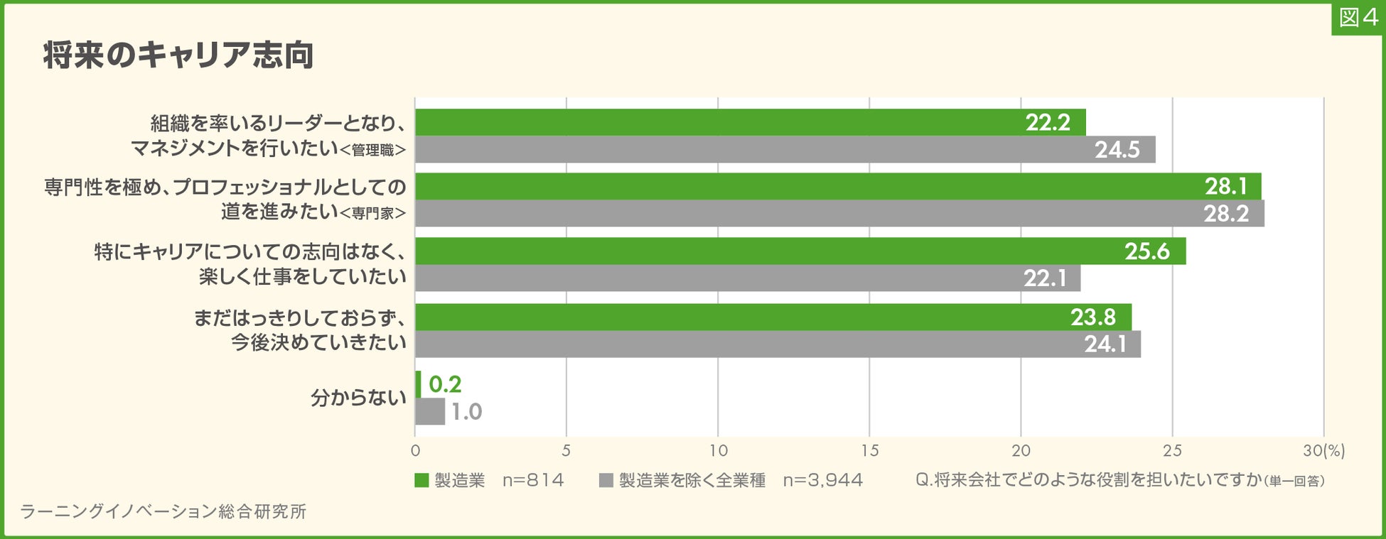 一方、「特にキャリアについての志向はなく、楽しく仕事をしていたい」と回答した割合が25.6%で、他業種より3.5ポイント高く、製造業の新入社員の4人に1人が「キャリア志向がない」という結果となりました。(図4)