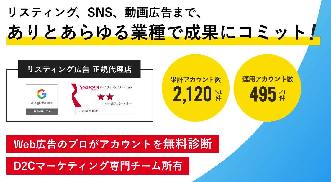 累計アカウント数2,120件、運用アカウント数495件の豊富なWeb広告運用実績と、GoogleやYahoo!に認められた確かな広告運用力があります。Googleが主催する「Premier Partner Awards」では、4期連続の国内ファイナリストに選出されており(※1)、Yahoo!のパートナー制度では、2つ星の代理店として認定を受けると同時に、国内で35社のみの広告運用認定パートナーとしても認定を受けています(※2)。