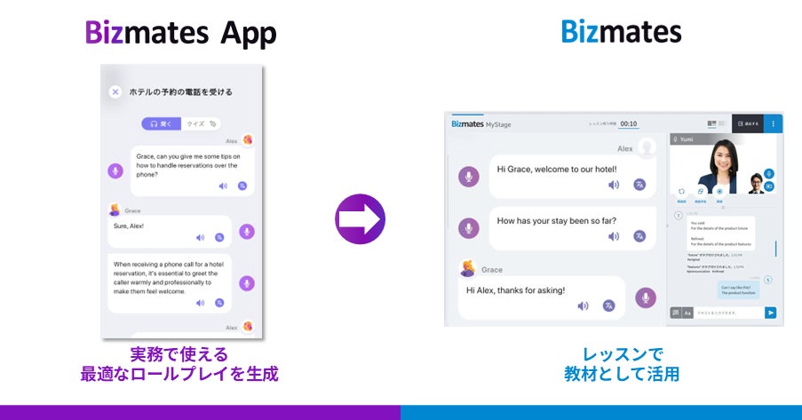 本格提供開始にあたり、AIが業種・職種・ビジネスシーンに応じて、学習者ごとに最適なロールプレイを自動生成する既存機能に加え、オンライン英会話サービス「Bizmates」と連携するPDF出力機能や、単語帳の自動連携機能を新たに追加。アプリと対人レッスンがシームレスにつながるハイブリッド型学習体験を実現しました。