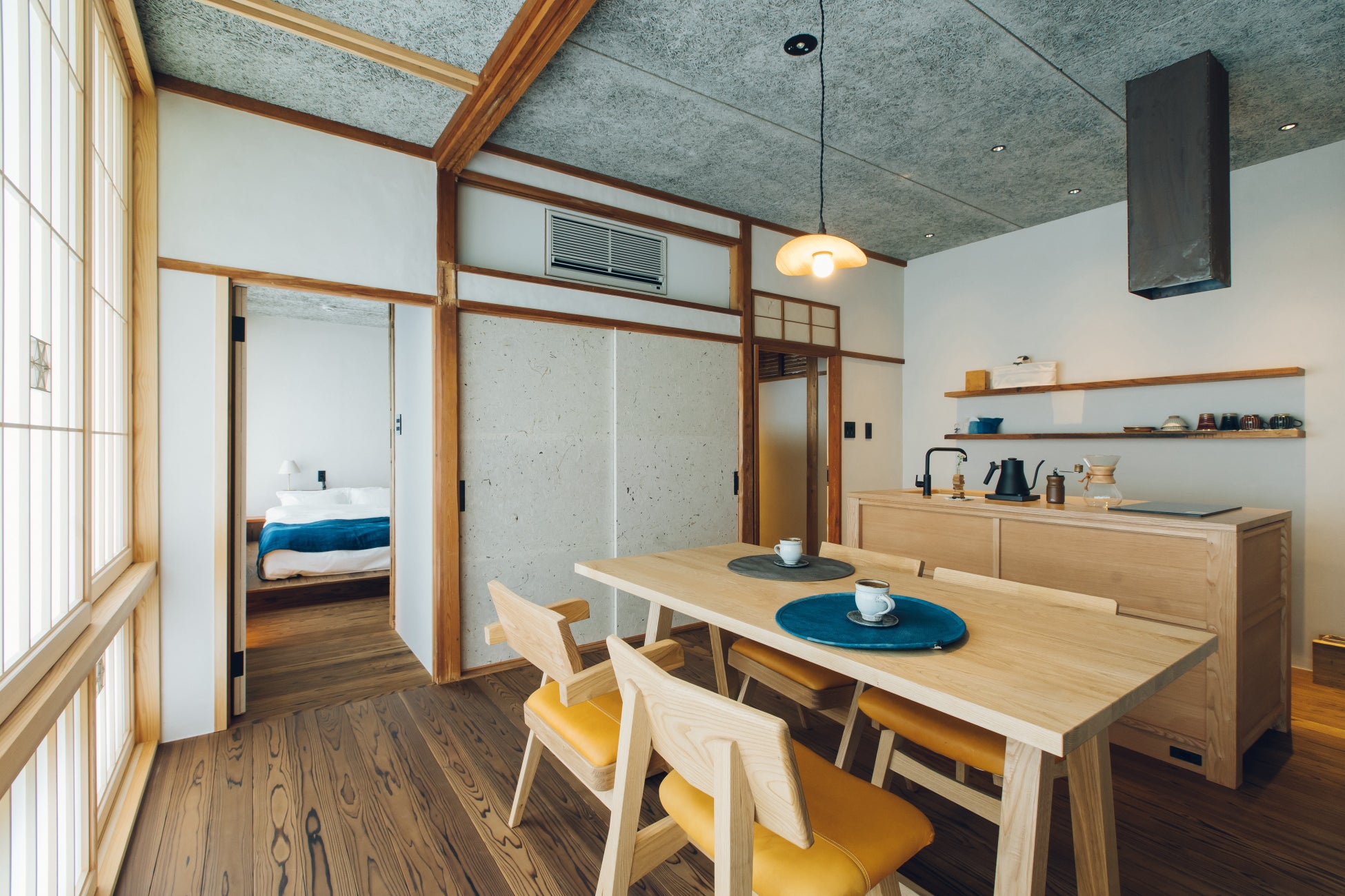 滞在先は、築50年の歴史を持つ旅館を丁寧にリノベーションして2022年にオープンした宿「Showcase Hotel KASANE」。建物や家具、さらにはファブリックまで、地元島根の職人の手によって作られたものばかり。伝統的な技術と新しいデザインが融合した美しい空間での滞在が楽しめます。各部屋にはキッチンも完備されており、自分たちのリズムで食事を楽しむことができます。そして、保育園まで車でわずか7分という距離も魅力の一つです。