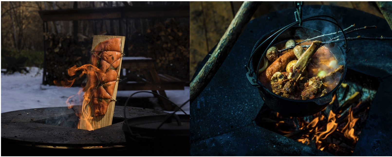 ライトアップされた雪の森を眺めながら暖炉揺らめくあたたかな店内でいただく晩餐。調理はウッドデッキ上の薪火キッチンと隣接するエアストリーム 内で行われ山暮らしの知恵・保存食を使ったポタージュやジビエ、スモークサーモンなど 薪火コース料理を間近に見ながら召し上がれます。ナチュールワインやノンアルコールクラフトビールに合わせてお召し上がりください。ナチュールワインやノンアルコールクラフトビールに合わせてお召し上がりください。