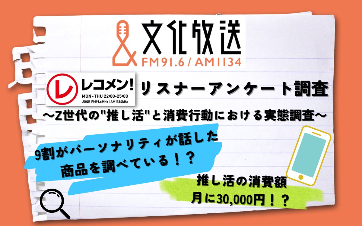 《文化放送 リスナーアンケート結果》若年層に人気のエンタメバラエティ『レコメン!』リスナーに聞いた!「Z世代の推し活と消費行動に関する調査」