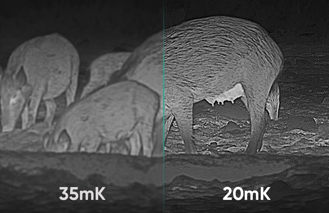 FALCONシリーズに搭載されているサーマルセンサーは、わずか0.02℃の温度差を認識することができ、それを画像処理してサーマル画像を生成します。このため、対象と周囲環境の温度差が少ないシーンでも対象を確実に捉えられるだけでなく、サーマル画像でありながら対象物の質感までもリアルに描写します。昼間には動物などの熱源を際立たせて表示し、夜間は全くの暗闇でも風景や動物がくっきりと表示されます。サーマルセンサーのピクセルピッチは12μm。モデルにより最大640x512ピクセルの解像度で対象を高精細に描写します。このセンサーと大口径レンズを組み合わせることにより、対象物を高画質で表示することができます。