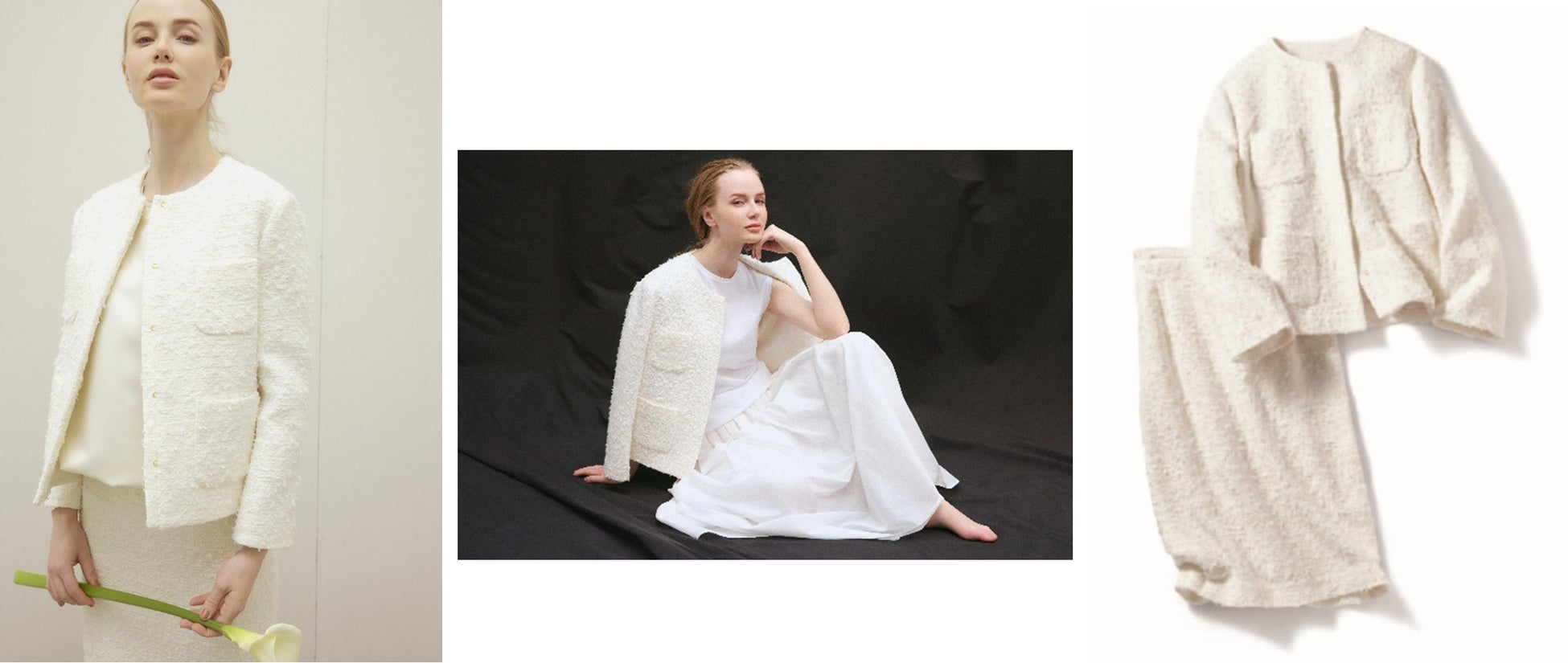 右:スラブ綿ツイード・ノーカラージャケット/¥72,000(税抜)