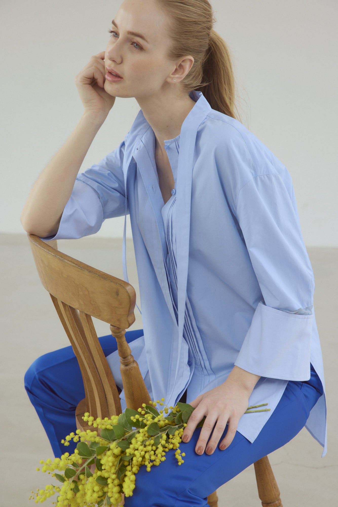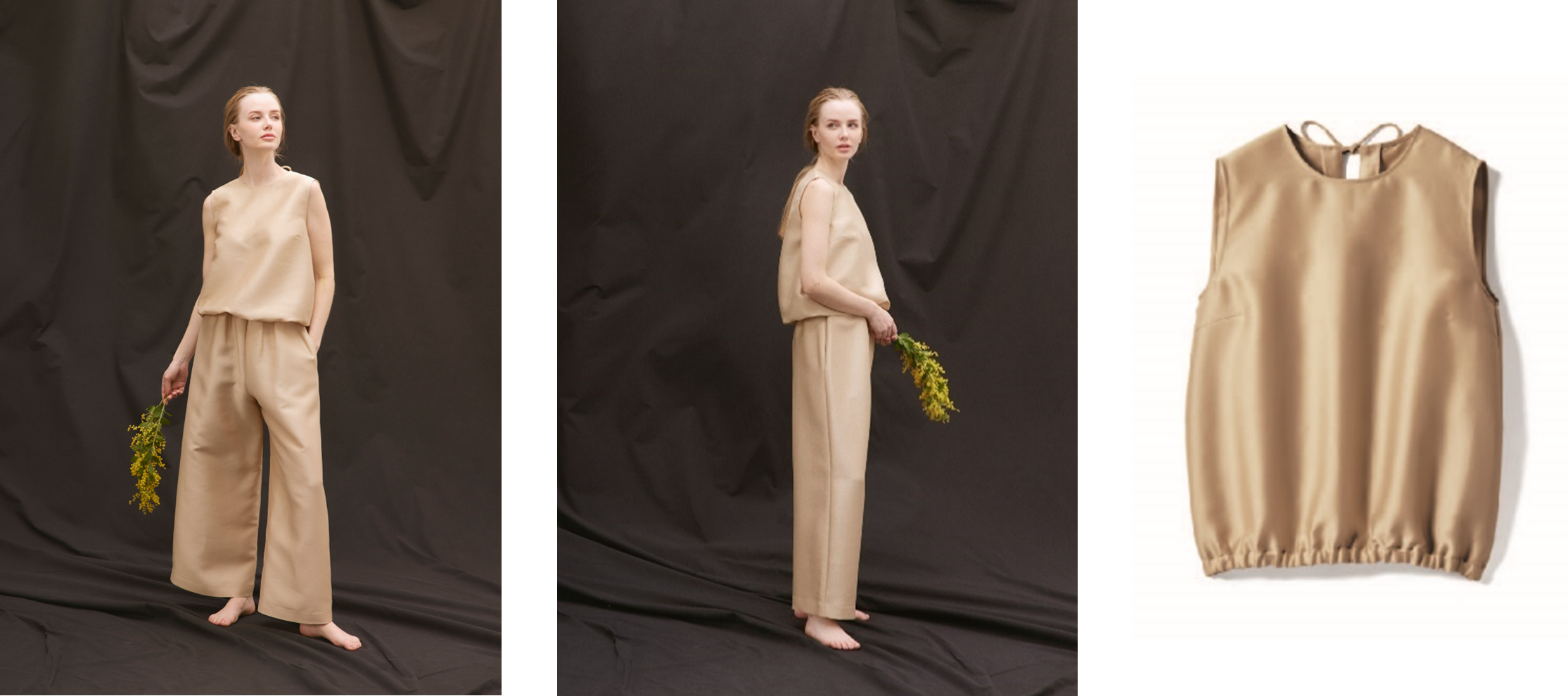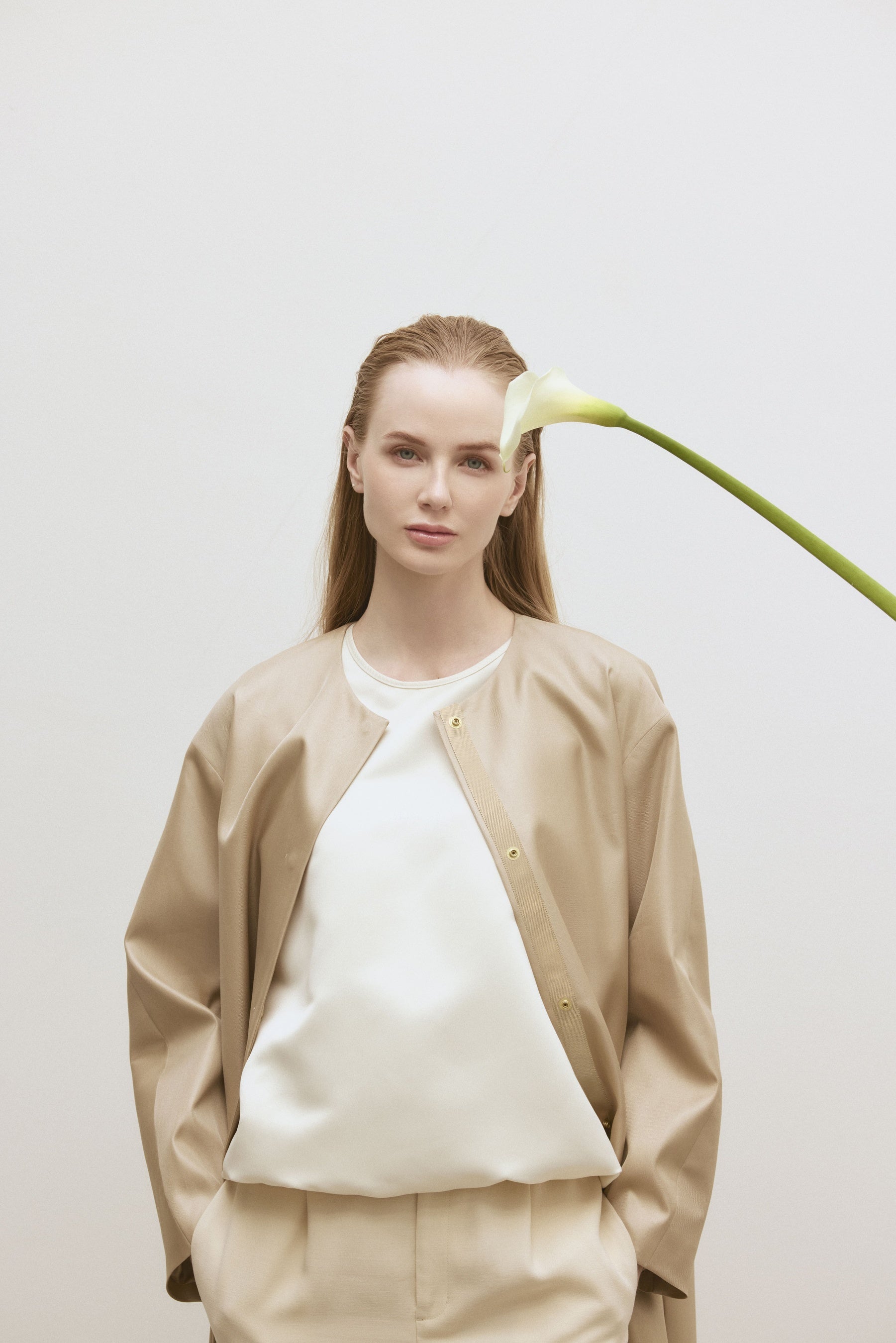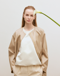 「立体裁断による、空気をはらんだような立ち上がり」が非常によくわかる一着。一見、ふっくらとしたカッティングに見えるものの、袖を通すとすっきりと洗練され、まるでツヤと風を纏っているように感じるトップスです。