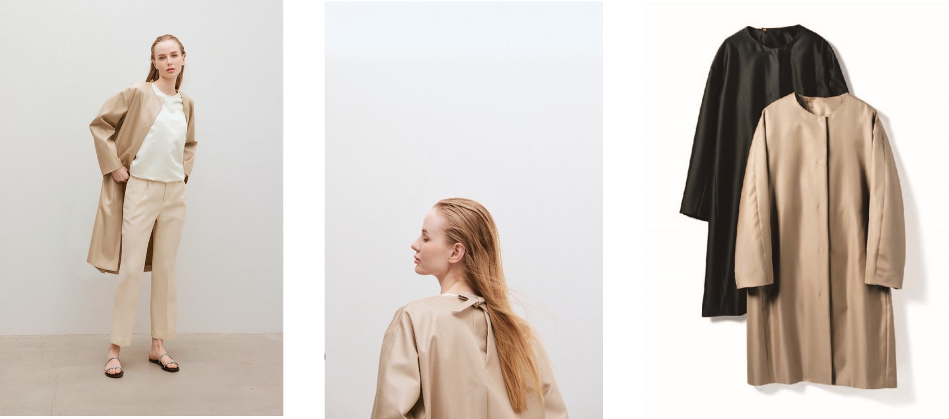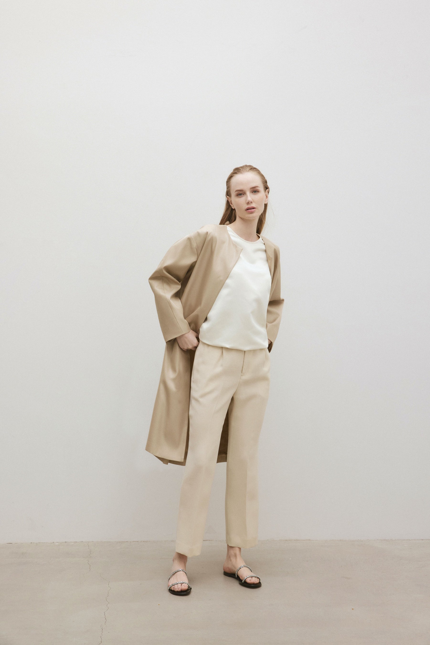 羽衣のように軽く艶のあるシルク混のノーカラーコートは、ゆったりと構築的な立体フォルムがモダンな印象。背中の共布リボンでひとさじの甘さをプラスしました。