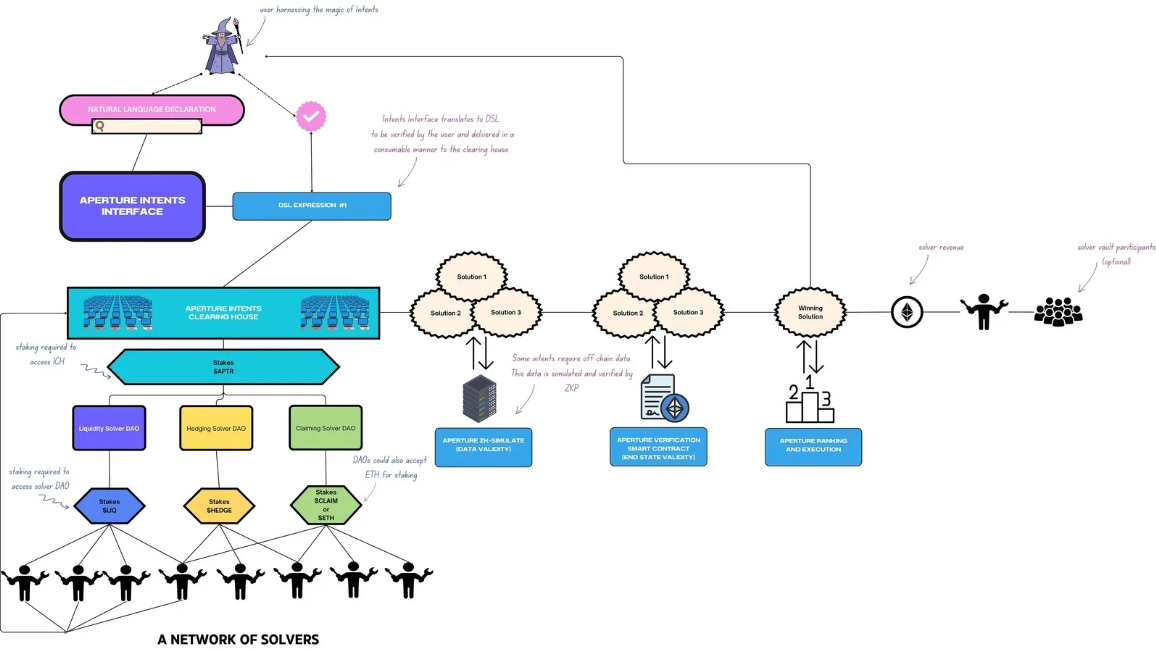 Aperture Financeは、チャットボットUXによってブロックチェーン操作を変化させるインテントベースのインフラストラクチャーです。ユーザーは自然言語を用いて「意図を宣言」することで、ソルバーのネットワークにアクセスして現在の取引環境の中で可能な、最も優れた手順の実行ができるようになります。このことは、Web3ユーザー体験の劇的な向上を期待できます。
