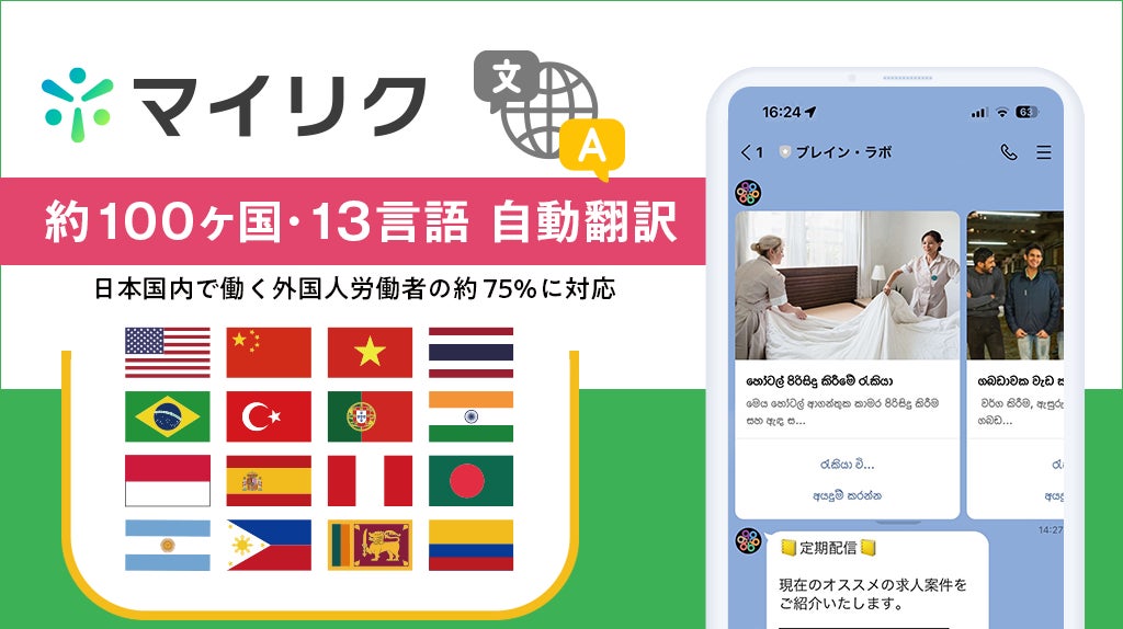 LINE公式アカウントの拡張ツールで外国人材の活用を支援 「マイリク」が13ヶ国語(約100ヶ国)への自動翻訳機能を搭載