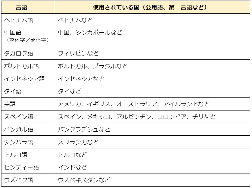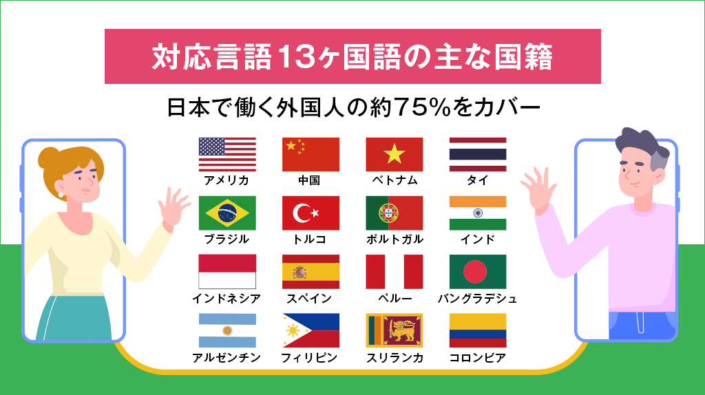 日本で働く外国人の出身国TOP3(ベトナム、中国、フィリピン)をカバーしており、先述の厚生労働省調査で、国籍別増加率が最も高かったインドネシア(対前年56%増)など東南アジアの複数の言語にも対応します。