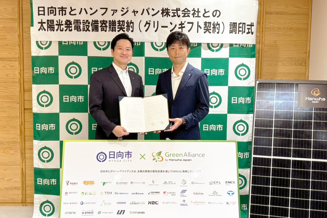 ハンファジャパン株式会社(所在地:東京都港区 代表取締役:張 熙載、以下ハンファジャパン)が主宰するSDGsパートナーシップ制度「Green Alliance(グリーンアライアンス)」は、このたび、宮崎県日向市との間で「太陽光発電設備寄贈契約」を締結しました。本契約に基づき、老朽化により建て替えが進められている「日向市総合体育館」に対し、太陽光発電システム(出力13.12kW)および蓄電池を寄贈します。
