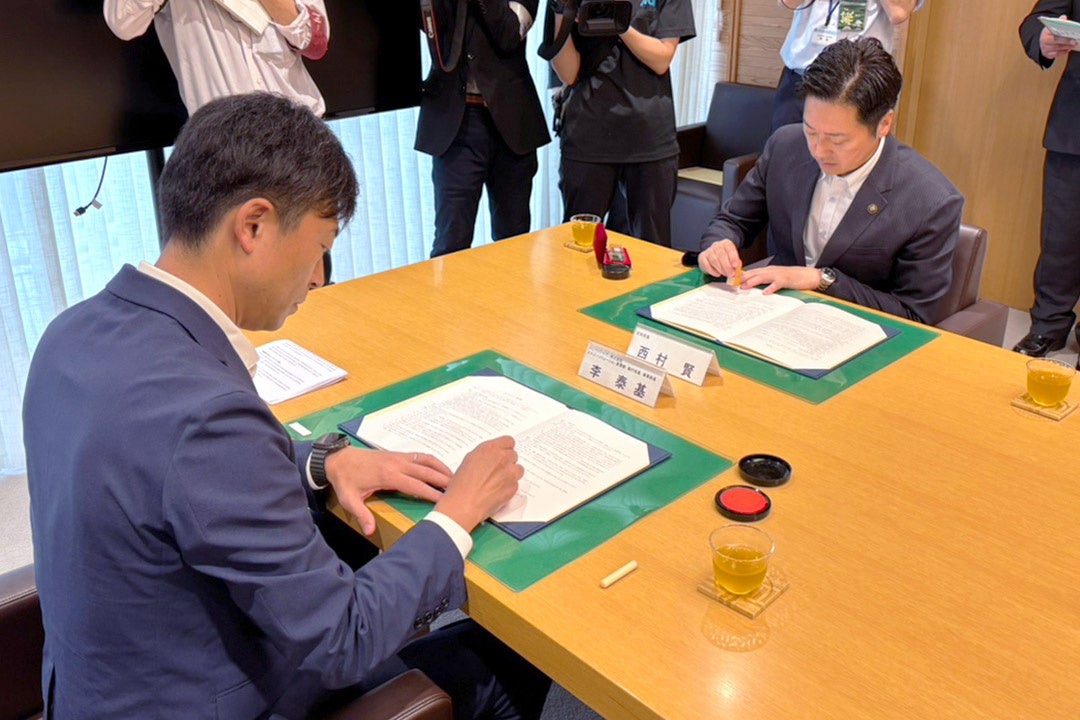 寄贈契約の締結にあたり、2025年7月11日(金)、日向市役所にて協定調印式が執り行われました。調印式には、宮崎県日向市長 西村 賢様、グリーンアライアンス事務局代表 李 泰基をはじめとする関係者が出席し、両者による取り組みの意義が改めて確認されました。